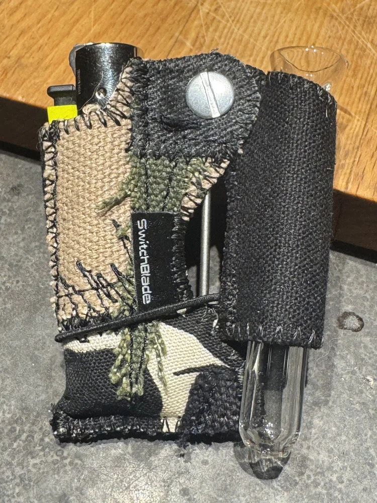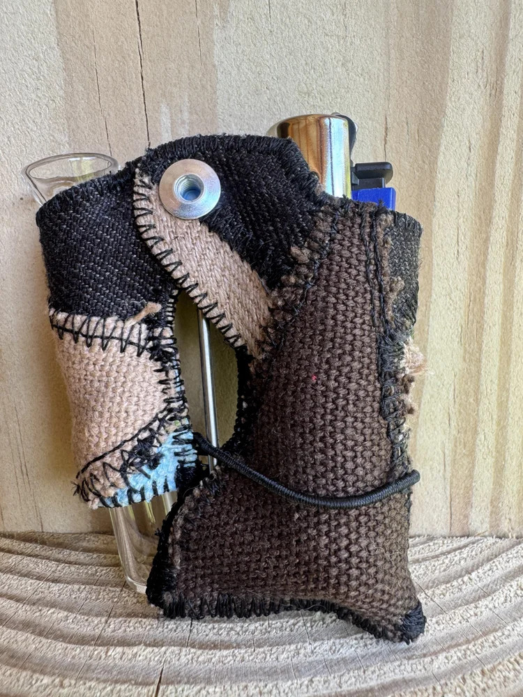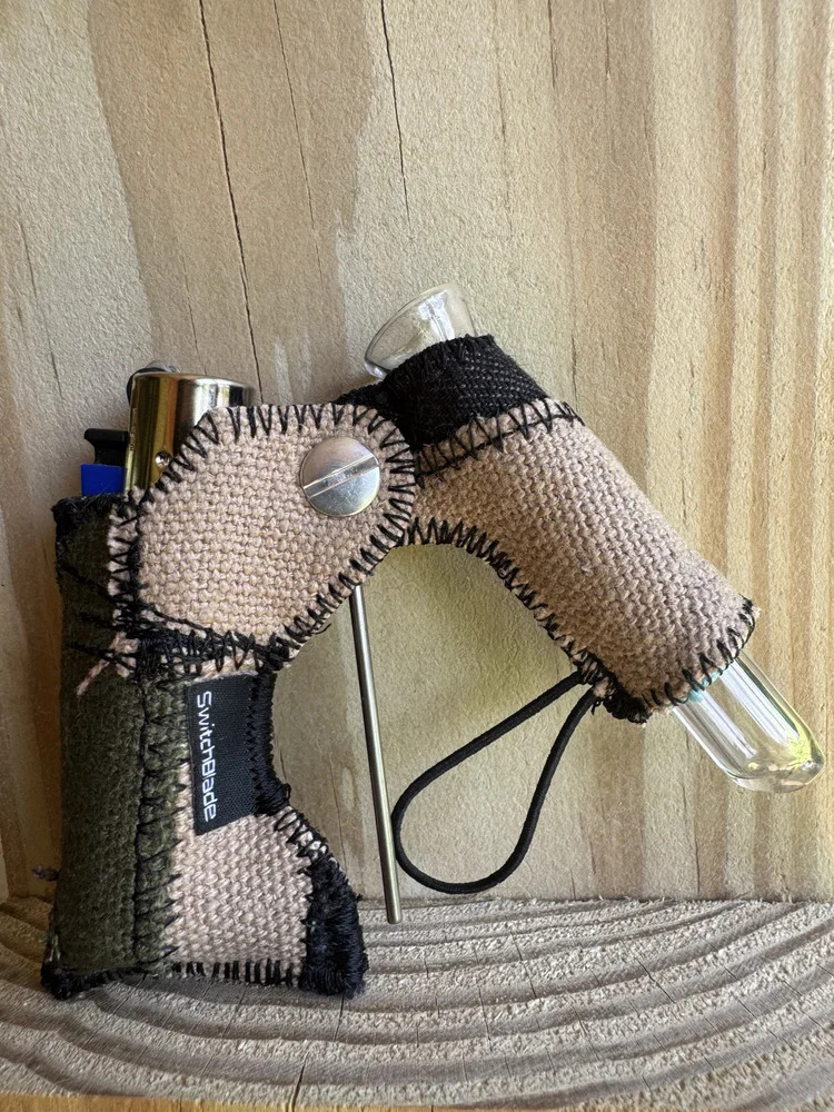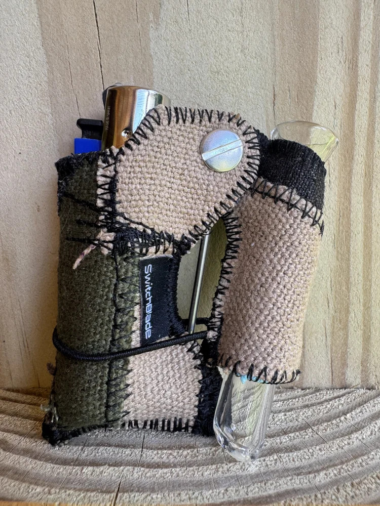 This is our traditional patch work made entirely from scraps and put together with the upmost artist approach. Each small patch chosen to be cut into a switchblade has its own special appeal… and is close to impossible to be duplicated. When purchasing this you are supporting the craftsmanship of most sustainable smoking device on the planet…. made with hemp… definitely one of our favorite materials to sew with. Each 420 SwitchBlade is handmade in the USA and comes with the handmade SwitchBlade, a glass pipe made by SwitchBlade, and a stainless steel poker. Fits BICS but we recommend Clipper. We promote clipper because they are refillable and much more ergonomic for a much easier use of our product.